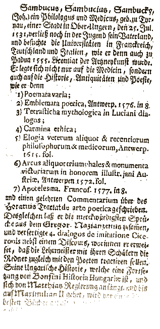 Im 33. Band des „Großen Vollstaendigen Universal Lexikons“ von Johann Heinrich Zedler (Dresden 1742) kann man auf S. 1654 über Johannes Sambucus u. a. folgendes lesen: (Bitte auf das Textfragment rechts klicken um den vollständigen Text lesen zu können.) |